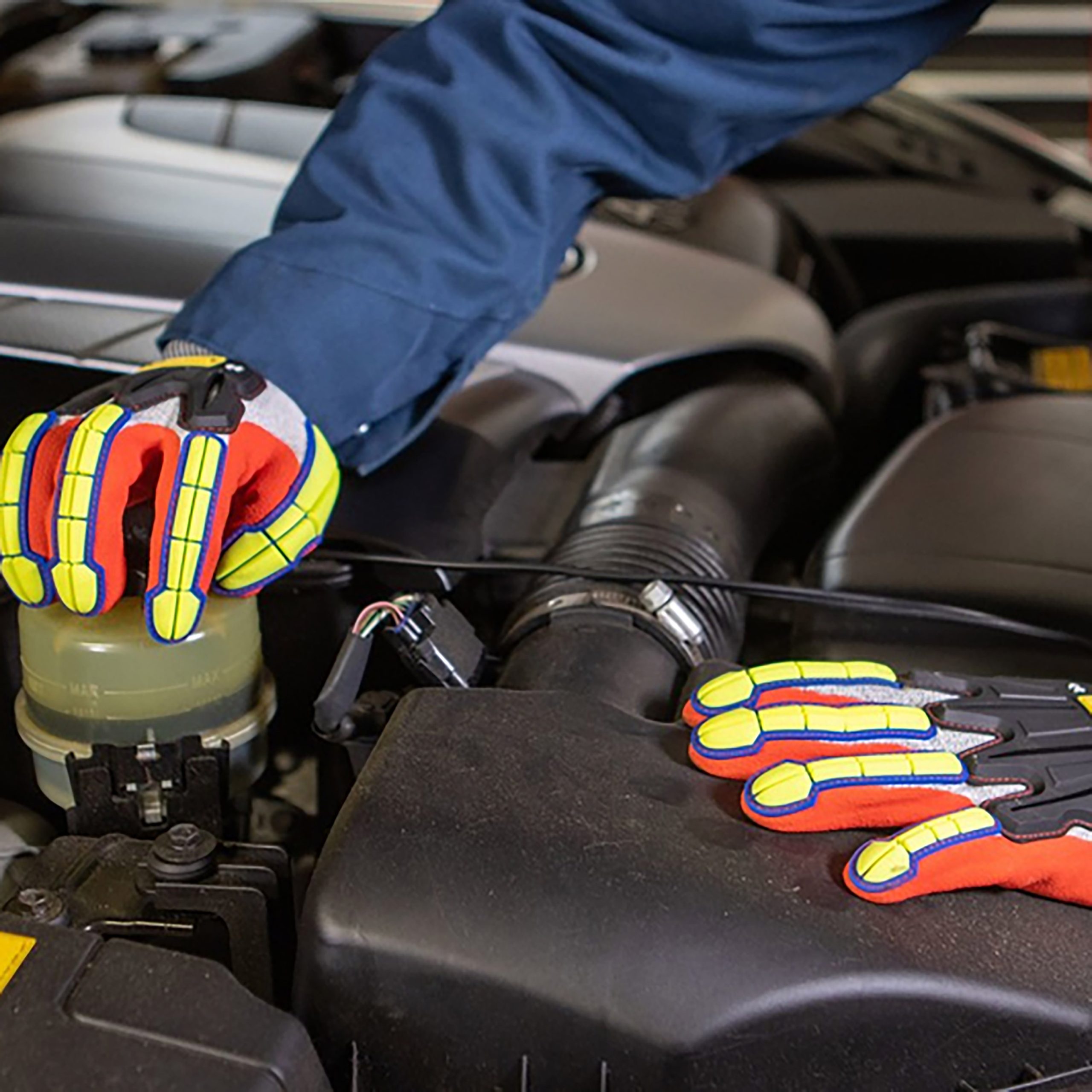 • Protección contra impactos de caucho termoplástico en la parte superior de la mano y en toda la longitud de los dedos.